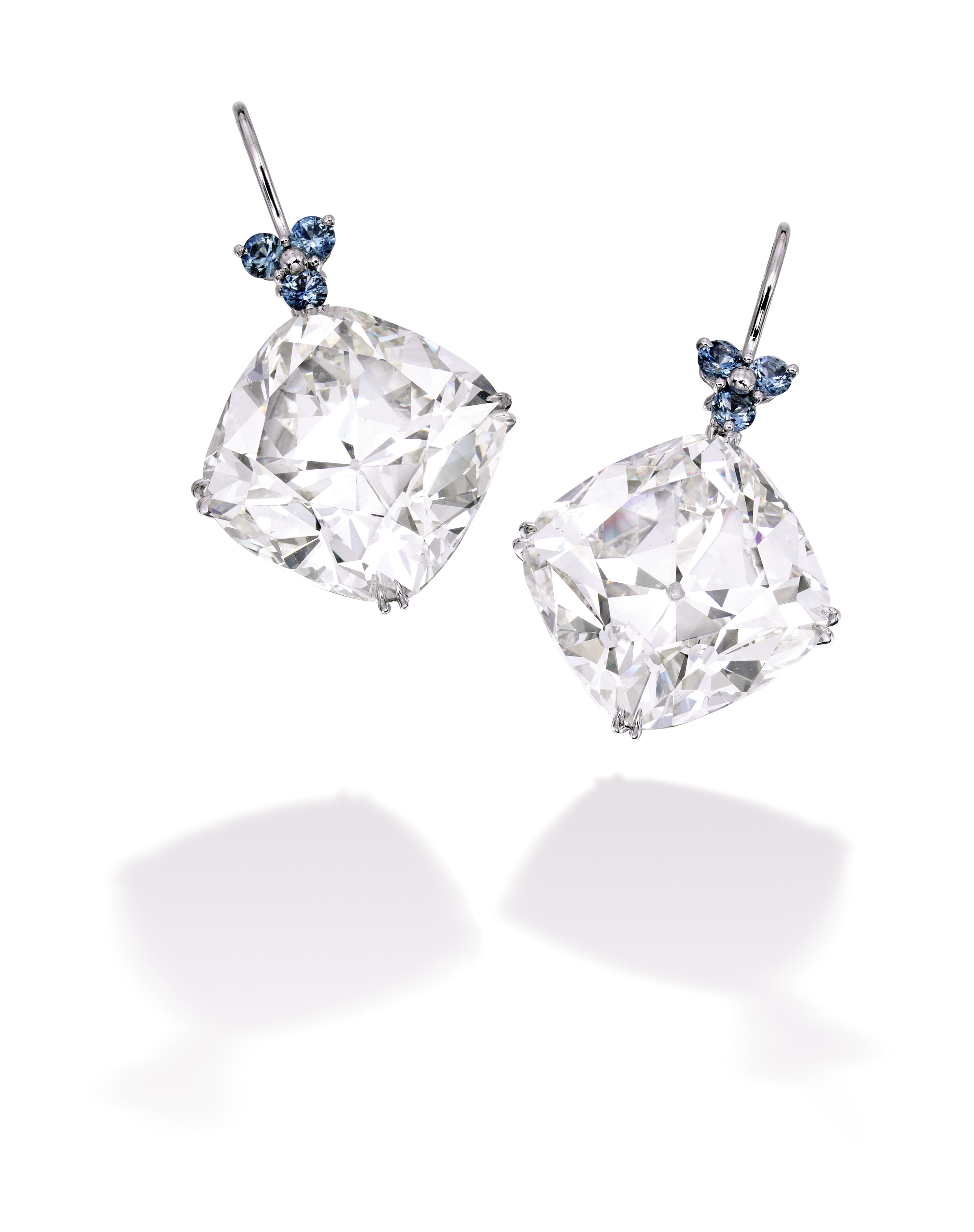 Important Pair of Platinum, Diamond and Sapphire Earrings. Suspending two cushion-cut diamonds weighing 29.39 and 28.03 carats, surmounted by round sapphires weighing 1.02 carats. Estimate: $1,650,000 — 1,850,000